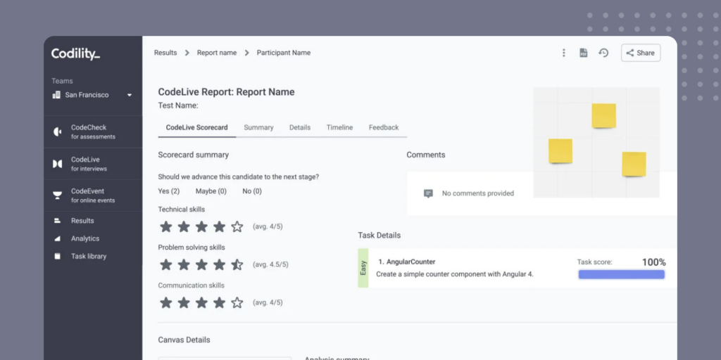 Codility specialises in technical assessments with plagiarism detection, suspicious‑behaviour flags and ID verification. It provides detailed reports on correctness, performance and complexity to enable data‑driven hiring decisions.