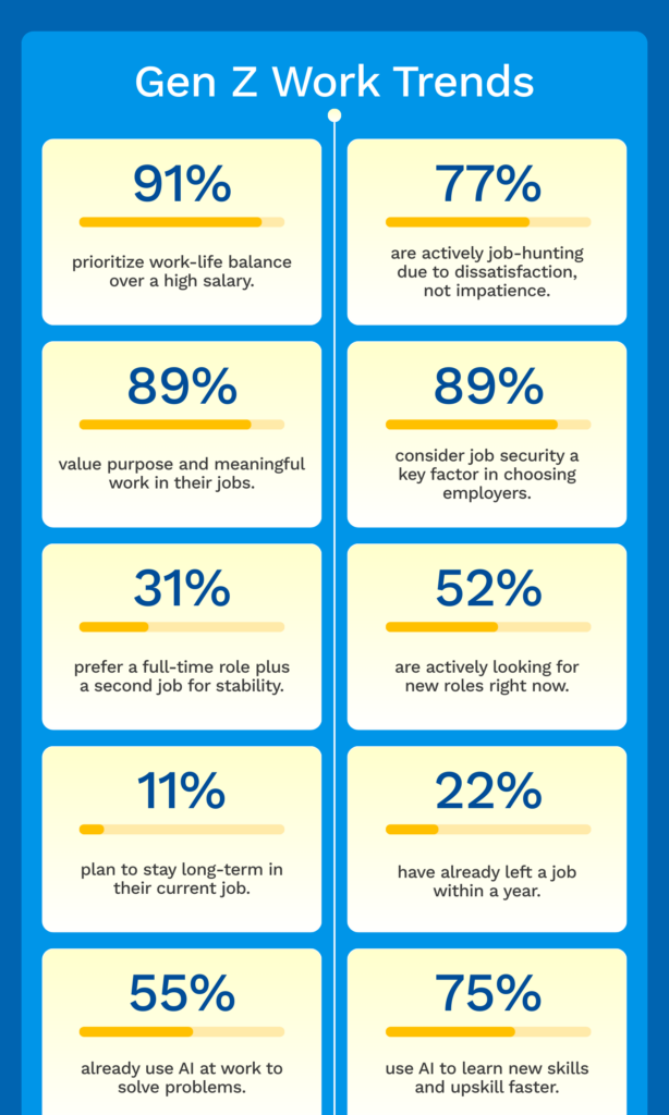 This anxiety fuels moonlighting culture – Randstad finds that only 45% of Gen Z talent hold traditional full‑time roles and that 31 % would prefer to pair a full‑time job with a second job. More than half (52 %) are actively looking for new roles, while only 11 % plan to stay in their current job long term.